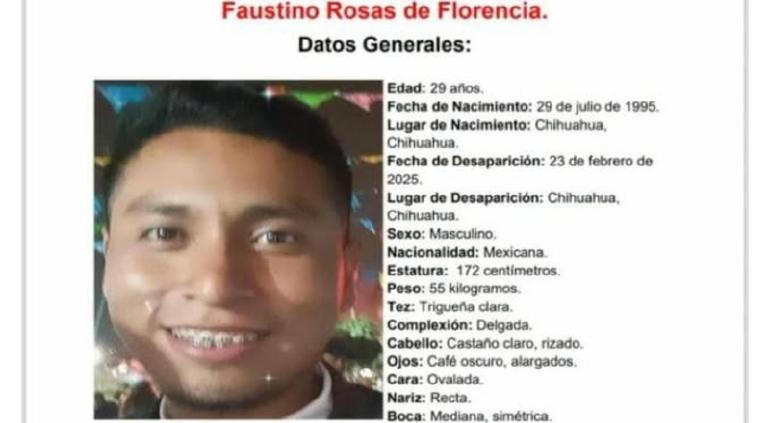 La Fiscalía solicita ayuda para encontrar a Faustino Rosas de Florencia de 29 años quien desapareció el 23 de febrero del presente año luego de salir de su casa en la colonia Vistas de Cerro Grande. Por ahora se desconoce su paradero.