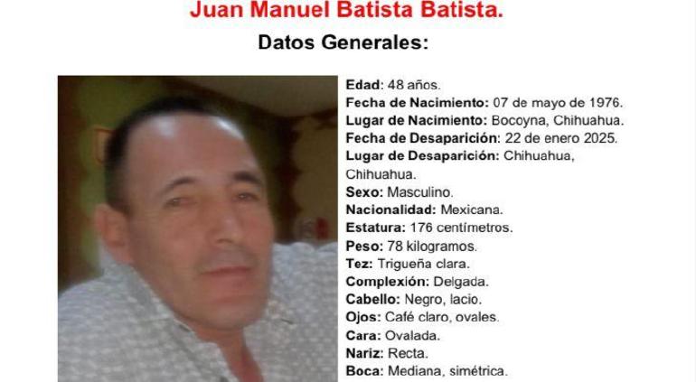 Juan Manuel Batista Batista de 48 años, originario de Bocoyna, desapareció hace seis días luego de salir de la Comandancia Sur en Chihuahua Capital. Desde ese día su familia no sabe nada de él y por ello piden ayuda a la ciudadanía para localizarlo sano y salvo.
