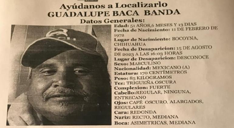 La Fiscalía y familiares solicitan ayuda para encontrar a Guadalupe Baca Banda de 51 años, originario de Bocoyna, quien desapareció el 15 de agosto del presente año. Por ahora se desconoce su paradero.
