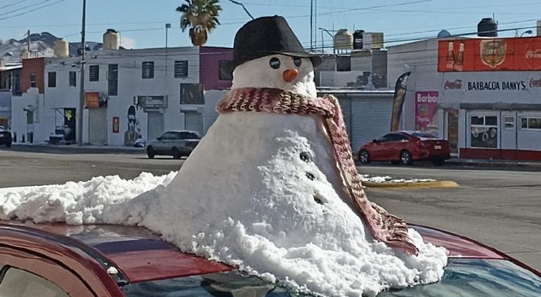 Algunos de los vecinos de Jardines del Sol, decidieron aprovechar este clima y crear un bonito muñeco con la nieve que había sobre un carro estacionado en la calle, mismo en el que dejaron “posando” al muñeco.