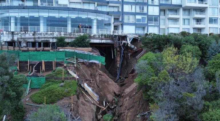 El edificio de departamentos Euromarina II en Viña del Mar, Chile, corre riesgo de colapsar por un socavón que se formó por las intensas lluvias y por el hecho de estar en una zona que es considerada inestable.