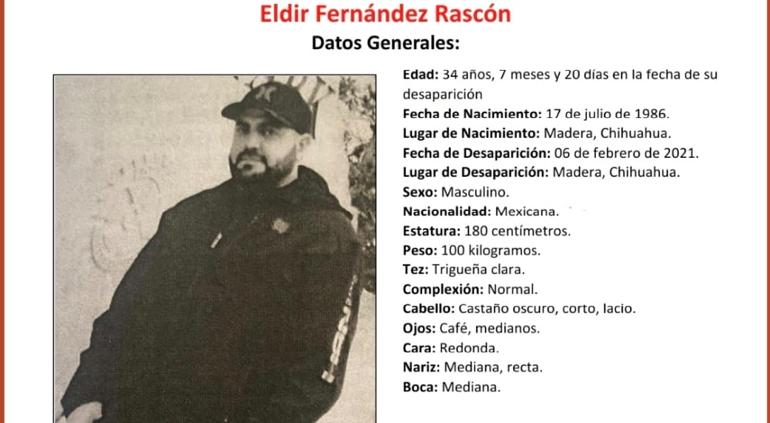 La Fiscalía General del Estado de Chihuahua, publicó la pesquisa de Eldir Fernández Rascón, de 34 años de edad (al momento de su ausencia), quien desapareció hace cuatro años en Madera, Chihuahua.