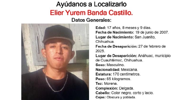 La Fiscalía solicita ayuda para encontrar al joven Elier Yurem Banda Castillo de 17 años, originario de San Juanito, quien desapareció el 27 de febrero del presente año en Cuauhtémoc. Por ahora se desconoce su paradero.