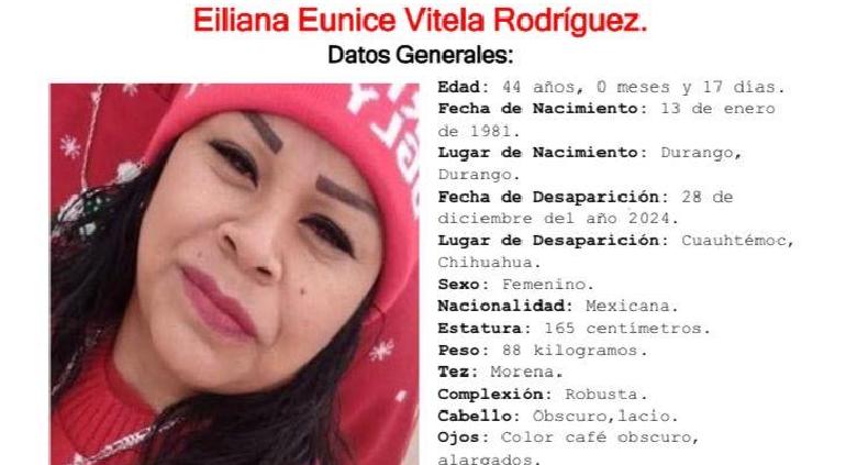 El 28 de diciembre de 2024, desapareció en Cuauhtémoc, Eiliana Eunice Vitela Rodríguez. Es originaria de Durango y tiene 44 años de edad.