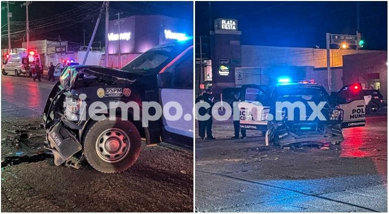 Dos personas resultaron lesionadas tras un fuerte choque el cruce de las calles Industrias y Dostoeivsky, al norte de la ciudad, donde una patrulla de la Policía Municipal quedó destrozada.