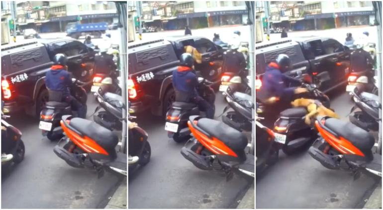 En medio de una parada de un semáforo en rojo en una calle de Taipéi 🇹🇼, un pitbull supuestamente abrió la ventana de la camioneta, saltó y atacó a un conductor de una motocicleta que estaba detrás del vehículo 😟😧 pic.twitter.com/UNaapkgMRJ