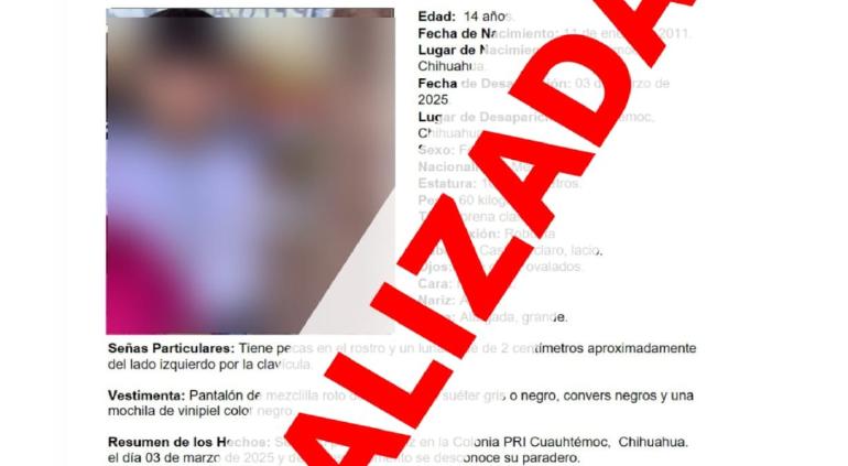 La menor de 14 años de edad, contaba con reporte de ausencia interpuesto ante esta representación social el pasado lunes 03 de marzo, en la ciudad de Cuauhtémoc, siendo localizada este miércoles en la colonia Tierra Nueva, en la misma ciudad.