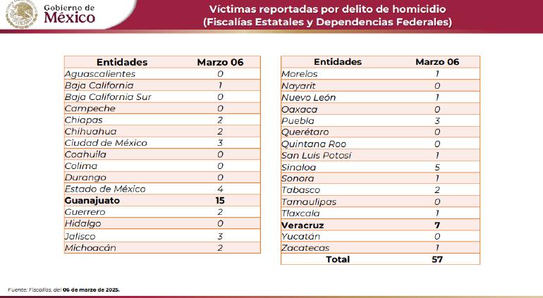 La Comisión Nacional de Seguridad (CNS) publicó el reporte de homicidios dolosos diarios del día jueves 6 de marzo, con un total de 57 en todo el país.