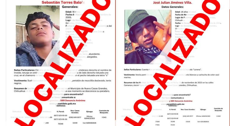 La Fiscalía Zona Noroeste, informó que luego de labores de búsqueda e investigación, lograron dar con el paradero de José Julián J.V., y Sebastián T.B., quienes tenían pesquisas publicadas por su desaparición desde el 14 de noviembre.