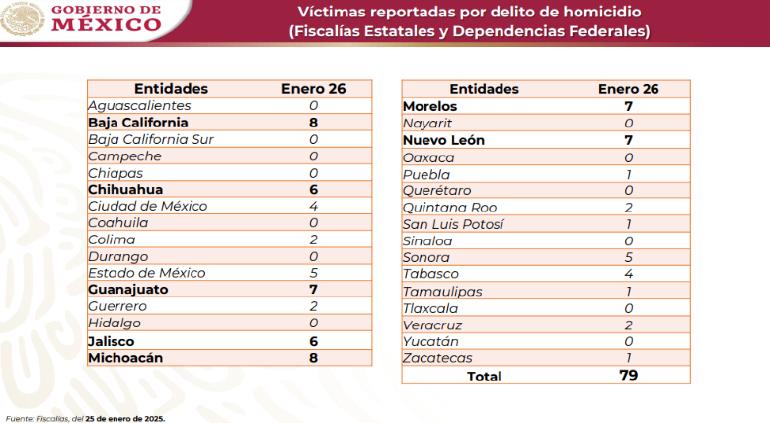 La Secretaría de Seguridad y Protección Ciudadana (SSPC) emitió el reporte preliminar de homicidios del domingo 26 de enero.