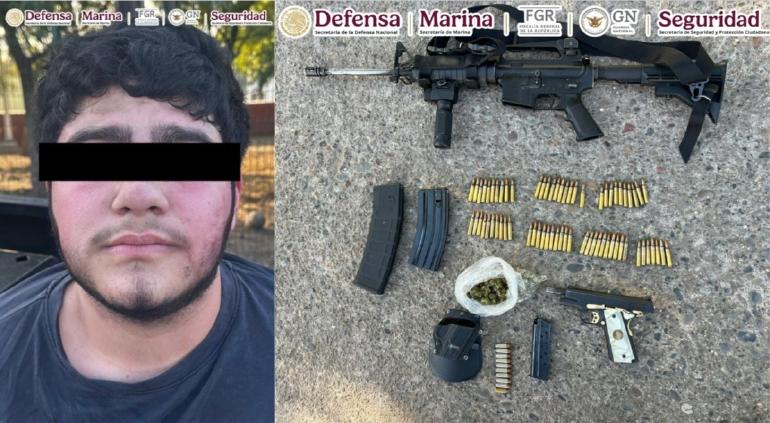 Agentes arrestaron a un joven de 19 años de edad perteneciente a un grupo delictivo, tras encontrarlo en posesión de armas de fuego cuando circulaba en un vehículo con reporte de robo en Culiacán, Sinaloa.
