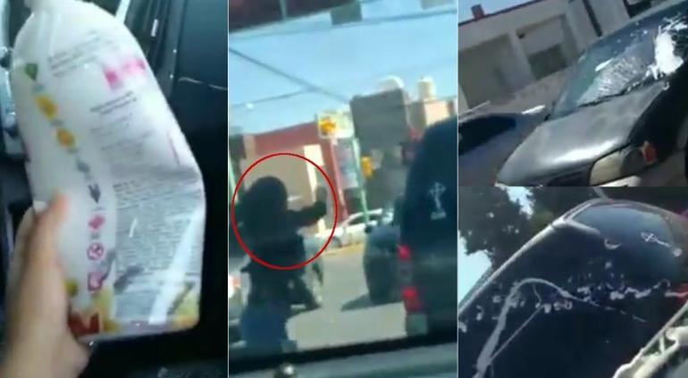 Entre gritos y ofensas la persecución llegó a un cruce donde el semáforo estaba en rojo, por lo que la mujer que se encontraba en el auto desde donde era grabado el video descendió de su vehículo con bote de crema en mano y arrojó el contenido sobre el vehículo de la otra conductora.