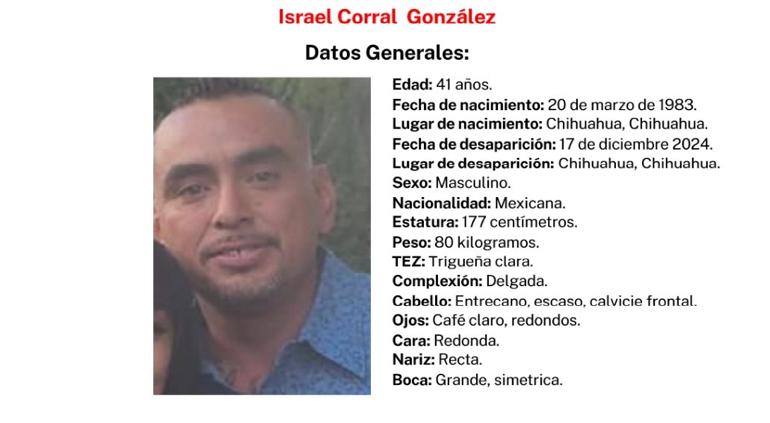 Israel Corral González, de 41 años de edad, desapareció el pasado 17 de diciembre de 2024, y hasta hoy, sus familiares desconocen de su paradero. Continúan con su búsqueda.