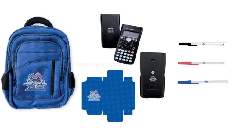 Tanto la mochila como la calculadora, la protección y las plumas tendrán el logotipo de la administración municipal con el mensaje ‘Chihuahua, capital de trabajo y resultados’.