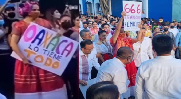 Mujer sorprendió a gobernador de Oaxaca con cartel de protesta 🎥