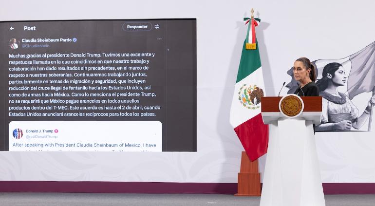 La presidenta Claudia Sheinbaum Pardo informó sobre los resultados de la conversación telefónica que sostuvo con su homólogo de Estados Unidos, Donald Trump, en la que abordaron la reciente imposición de aranceles del 25% a productos mexicanos.