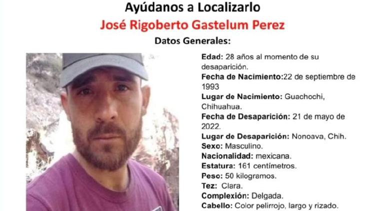 José Rigoberto Gastelum Pérez de 28 años, originario de Guachochi, desapareció hace dos años y 10 meses en Nonoava. Desde ese día su familia no sabe nada de él y por ello piden ayuda a la ciudadanía para localizarlo sano y salvo.
