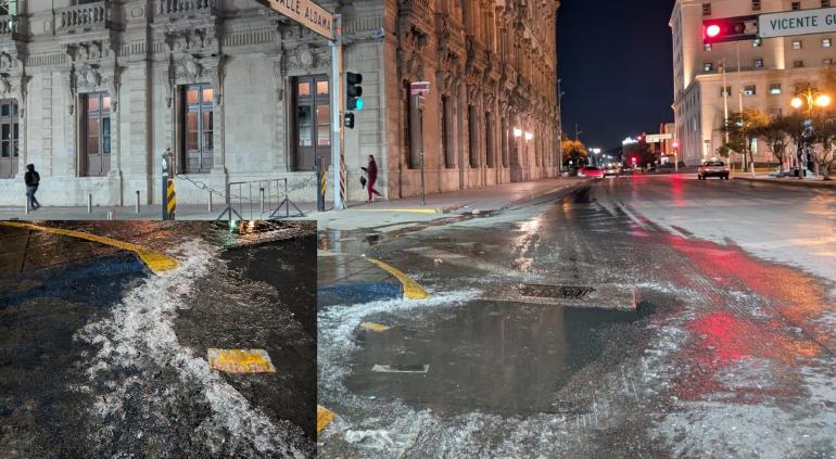 Esta mañana en Chihuahua, una parte de la calle Aldama se congeló debido a una fuerte helada de -7°C.