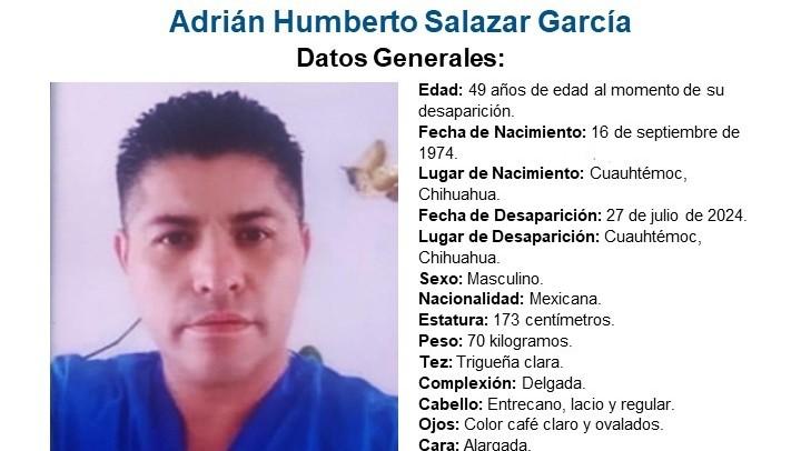 De acuerdo con el reporte oficial, Salazar García, de 49 años, fue visto por última vez el 27 de julio de 2024 en la ciudad de Cuauhtémoc, Chihuahua.