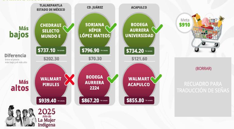 La Procuraduría Federal del Consumidor (Profeco) reconoció a Soriana Híper San Lorenzo y a Bodega Aurrerá 2224 por ofrecer la canasta básica a precios por debajo de los 910 pesos, durante su informe semanal en la conferencia matutina de la presidenta Claudia Sheinbaum.