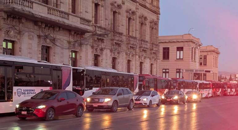 Esta mañana el Centro de la ciudad de Chihuahua se vio afectado por una manifestación de choferes del sistema de transporte Bowi, quienes estacionaron entre 20 y 30 unidades en diversas avenidas principales para exigir mejoras laborales.