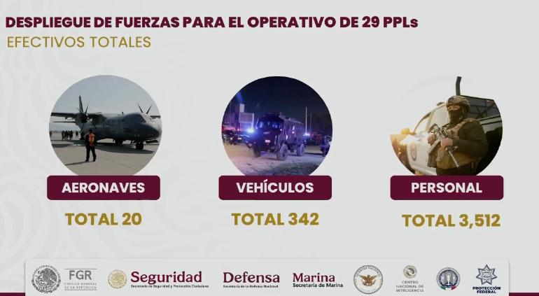 Para el traslado se usaron 342 vehículos y 20 aeronaves de la Secretaría de la Defensa Nacional, Secretaría Marina, Guardia Nacional, Secretaría de Seguridad, Centro Nacional de Inteligencia, así como de la Fiscalía General de la República, a través de la Agencia de Investigación Criminal.