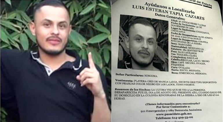 La tarde de este 9 de agosto informaron sobre la desaparición de Luis Esteban Tapia Cazares de 30 años de edad de quien no se sabe nada desde el anterior miércoles.