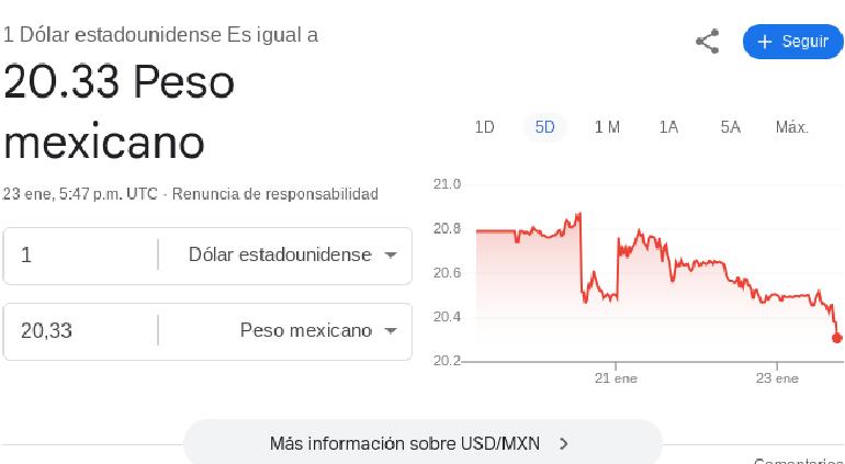 El dólar cayó este 23 de enero a 20.33 pesos en el mercado interbancario al corte de las 11:41 (hora centro de México), está en su nivel más bajo desde el 29 de diciembre y podría pronto llegar al menor nivel del último mes.