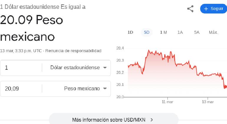 Este jueves 13 de marzo abrió el mercado cambiario operaciones con el dólar spot -tipo de cambio de referencia entre bancos- en un rango de 20.13 y 20.15 pesos mexicanos.