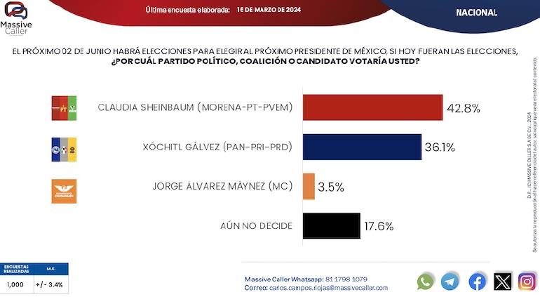 Claudia Sheinbaum presentó una preferencia del 42.8% del electorado, lo anterior, según reveló la encuestadora Massive Caller; Xóchitl Gálvez registra un 36.1% y Jorge Álvarez Máynez un 3.5 por cierto.