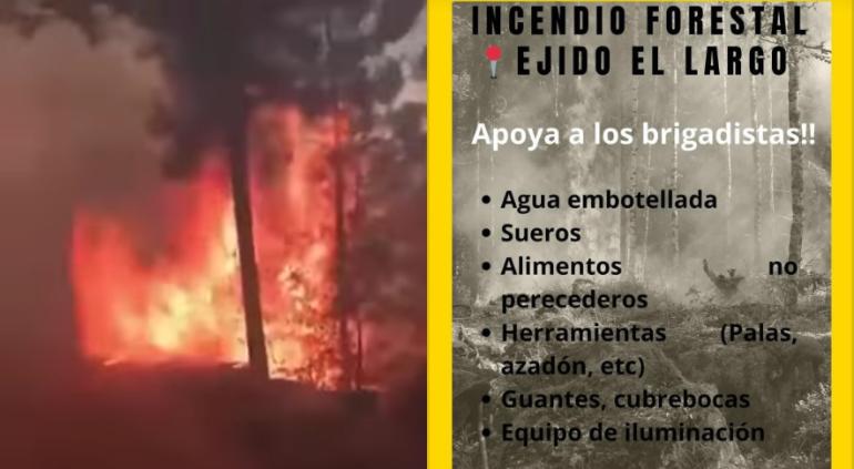 Solicitan ayuda para los brigadistas del Ejido El Largo que enfrentan los incendios forestales, piden instrumentos, agua y alimentos.