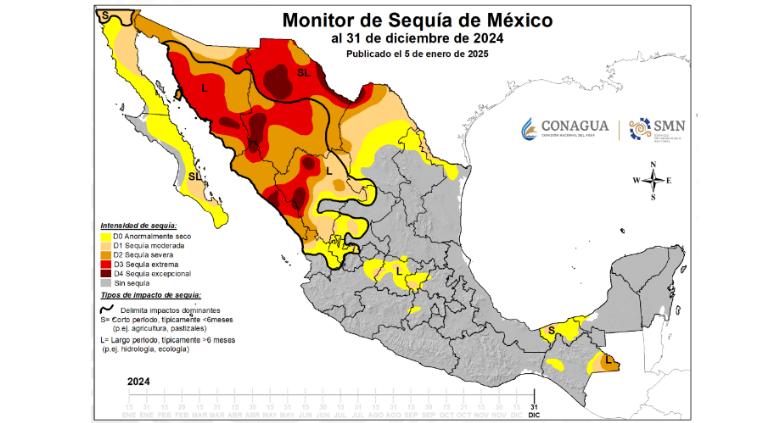 De acuerdo a la imagen de Monitor de Sequía indica que la zona norte del estado grande tiene un "impacto de sequía" entre un período corto y largo, alrededor de seis meses, mientras que el centro y sur de la entidad tiene un impacto de más de seis meses.