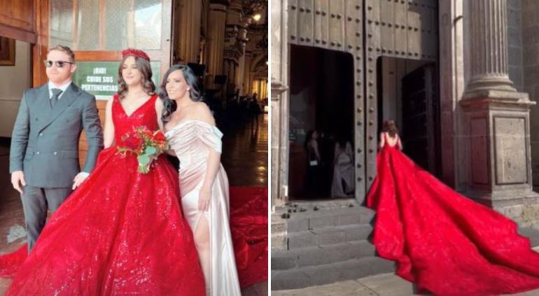 La quinceañera por su parte usó un vestido totalmente rojo de gran largo firmado por el diseñador Wil Medina.