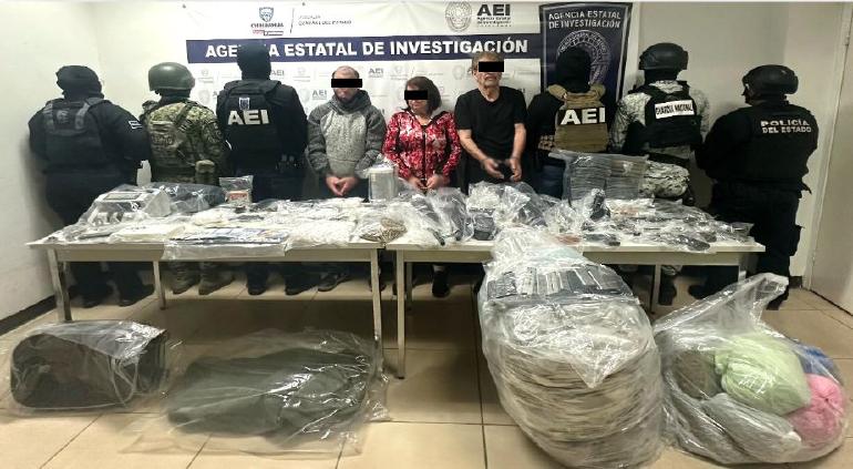 La Secretaría de Seguridad y Protección Ciudadana destacó la detención de tres personas y el aseguramiento de armas, droga y dinero en efectivo tras un cateo en un inmueble de Ciudad Juárez.