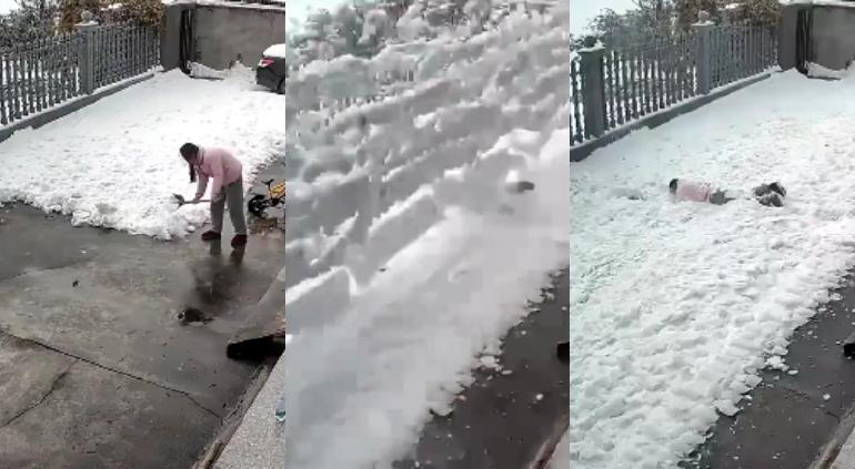 En las redes sociales, se hizo viral un video en el que se puede ver cómo una señora fue aplastada por un montón de nieve, la cual cae sobre ella mientras está limpiando la entrada de su casa.