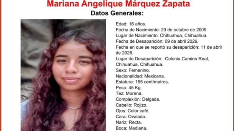 Autoridades estatales emitieron una alerta para localizar a Mariana Angelique Márquez Zapata, de 16 años de edad, quien fue reportada como desaparecida en la ciudad de Chihuahua.