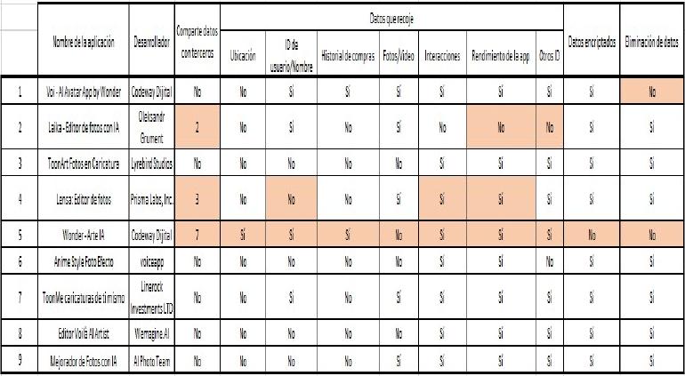 Las aplicaciones que analizaron fueron “Voi - AI Avatar App by Wonder”, “Laika - Editor de fotos con IA”, “ToonArt Fotos en Caricatura”, “Lensa: Editor de fotos”, “Wonder - Arte IA”, “Anime Style Foto Efecto”, “ToonMe caricaturas de ti mismo”, “Editor Voilà AI Artist” y “Mejorador de Fotos con IA”.