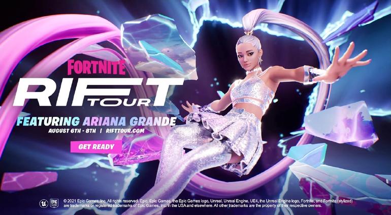 El 1 de agosto, la cuenta oficial de Twitter de Fortnite confirmó a través de un avance que Ariana Grande sería la artista presentada en el Rift Tour previamente anunciado, un concierto en el juego que los jugadores podrán ver.